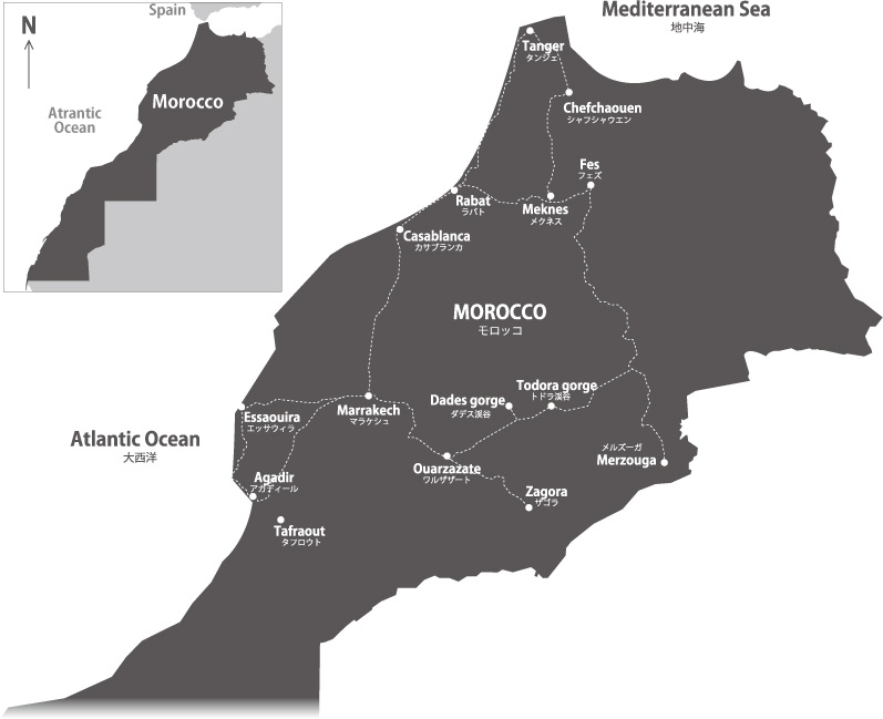 モロッコは北アフリカの西の端に位置する南北に長い国で、アラビア語では『日の沈む国』という意味の『マグレブ』と呼ばれています。